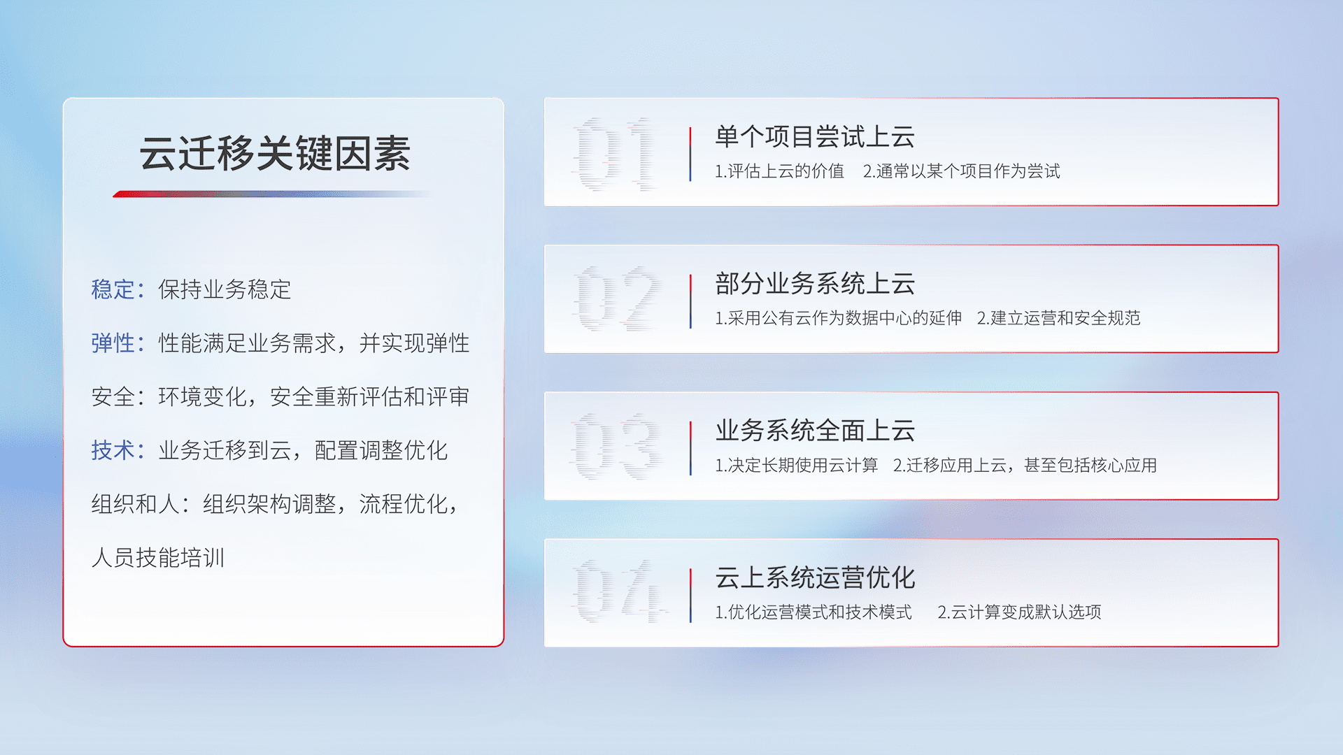 结合实际业务,,,,从规划设计、、、、云平台选型、、、云原生改造、、数据迁移、、、、集成交付,,迁移全过程为客户识别最佳上云路径,,,,做好风险识别管理,,设计网络架构、、、身份权限、、、、安全审计合规、、、、操作审计、、、日志审计、、、监控告警策略、、、多站点容灾设计等,,对云上基础设施进行整体规划,,,,提升IT治理水平,,,,以满足弹性、、、高可用、、、高性能的需求。。。。